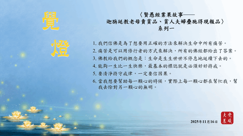 〈賢愚經業果故事──迦旃延教老母賣貧品、貧人夫婦疊施得現報品〉01 覺燈 (2025/11/16) Post author:大覺晨曦編輯組 Post published:2025/11/18 Post category:覺燈 1. 我們信佛是為了想要用正確的方法來解決生命中所有痛苦。2. 痛苦是可以用修行者的方式來解決,所有的佛經都給出了答案。3. 佛教給我們的概念是:生命是生生世世不停息地延續下去的。4. 能夠一生比一生快樂,最基本的標誌就是必須好好持戒。5. 要清淨持守戒律,一定要信因果。6. 當我想要幫助每一顆心的時候,實際上每一顆心都在幫忙我,幫我去除對另一顆心的無明。 累計閱覽數: 285 Read more articles Previous Post廣海明月0528 覺燈6 (2025/11/15) Next Post廣海明月0031 覺燈 (2025/11/17)