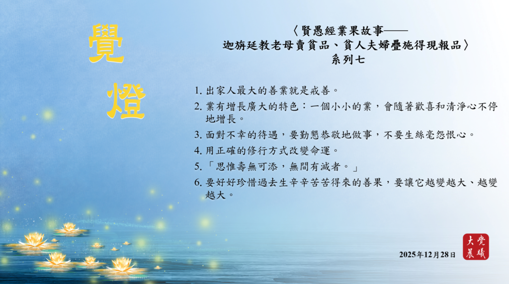 〈賢愚經業果故事──迦旃延教老母賣貧品、貧人夫婦疊施得現報品〉07 覺燈 (2025/12/28) Post author:大覺晨曦編輯組 Post published:2025/12/30 Post category:覺燈 1. 出家人最大的善業就是戒善。2. 業有增長廣大的特色:一個小小的業,會隨著歡喜和清淨心不停地增長。3. 面對不幸的待遇,要勤懇恭敬地做事,不要生絲毫怨恨心。4. 用正確的修行方式改變命運。5. 「思惟壽無可添,無間有減者。」6. 要好好珍惜過去生辛辛苦苦得來的善果,要讓它越變越大、越變越大。 累計閱覽數: 192 Read more articles Previous Post廣海明月0533 覺燈3 (2025/12/27) Next Post廣海明月0049 覺燈 (2025/12/29)