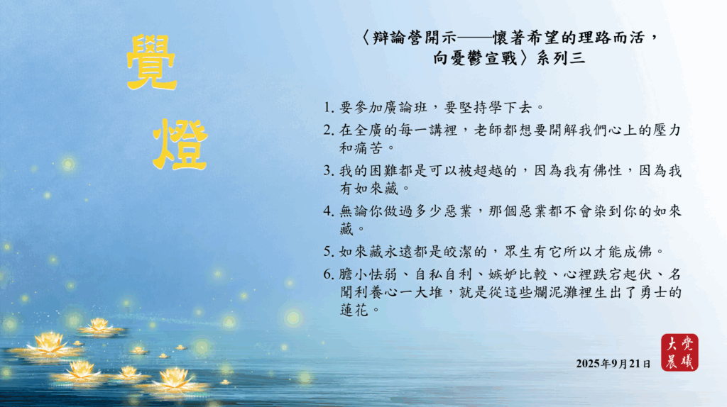 〈辯論營開示──懷著希望的理路而活,向憂鬱宣戰〉03 覺燈 (2025/09/21) Post author:大覺晨曦編輯組 Post published:2025/09/22 Post category:覺燈 1. 要參加廣論班,要堅持學下去。2. 在全廣的每一講裡,老師都想要開解我們心上的壓力和痛苦。3. 我的困難都是可以被超越的,因為我有佛性,因為我有如來藏。4. 無論你做過多少惡業, 那個惡業都不會染到你的如來藏。5. 如來藏永遠都是皎潔的,眾生有它所以才能成佛。6. 膽小怯弱、自私自利、嫉妒比較、心裡跌宕起伏、名聞利養心一大堆,就是從這些爛泥灘裡生出了勇士的蓮花。 累計閱覽數: 323 Read more articles Previous Post廣海明月0521 覺燈2 (2025/09/20) Next Post廣海明月0007 覺燈 (2025/09/22)