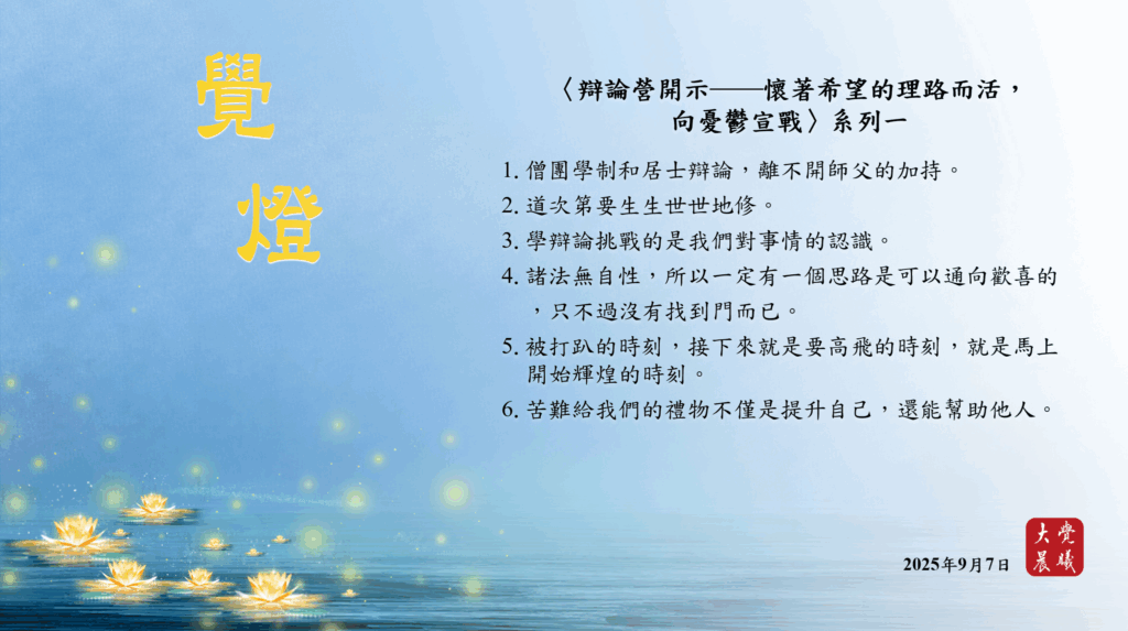 〈辯論營開示──懷著希望的理路而活,向憂鬱宣戰〉01 覺燈 (2025/09/07) Post author:大覺晨曦編輯組 Post published:2025/09/09 Post category:覺燈 1. 僧團學制和居士辯論,離不開師父的加持。2. 道次第要生生世世地修。3. 學辯論挑戰的是我們對事情的認識。4. 諸法無自性,所以一定有一個思路是可以通向歡喜的,只不過沒有找到門而已。5. 被打趴的時刻,接下來就是要高飛的時刻,就是馬上開始輝煌的時刻。6. 苦難給我們的禮物不僅是提升自己,還能幫助他人。 累計閱覽數: 377 Read more articles Previous Post廣海明月0519 覺燈3 (2025/09/06) Next Post廣海明月0001 覺燈 (2025/09/08)