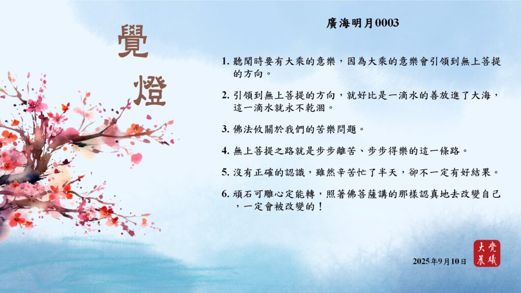 廣海明月0003 覺燈 (2025/09/10) Post author:大覺晨曦編輯組 Post published:2025/09/11 Post category:覺燈 1. 聽聞時要有大乘的意樂,因為大乘的意樂會引領到無上菩提的方向。2. 引領到無上菩提的方向,就好比是一滴水的善放進了大海,這一滴水就永不乾涸。3. 佛法攸關於我們的苦樂問題。4. 無上菩提之路就是步步離苦、步步得樂的這一條路。5. 沒有正確的認識,雖然辛苦忙了半天,卻不一定有好結果。6. 頑石可雕心定能轉,照著佛菩薩講的那樣認真地去改變自己,一定會被改變的! 累計閱覽數: 267 Read more articles Previous Post廣海明月0002 覺燈 (2025/09/09) Next Post廣海明月0520 覺燈1 (2025/09/11)