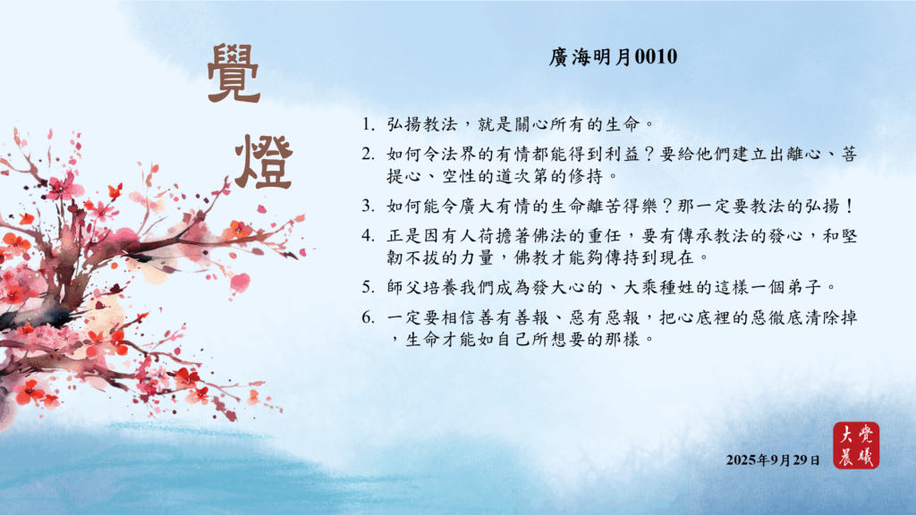 廣海明月0010 覺燈 (2025/09/29) Post author:大覺晨曦編輯組 Post published:2025/09/30 Post category:覺燈 1. 弘揚教法,就是關心所有的生命。2. 如何令法界的有情都能得到利益?要給他們建立出離心、菩提心、空性的道次第的修持。3. 如何能令廣大有情的生命離苦得樂?那一定要教法的弘揚!4. 正是因有人荷擔著佛法的重任,要有傳承教法的發心,和堅韌不拔的力量,佛教才能夠傳持到現在。5. 師父培養我們成為發大心的、大乘種姓的這樣一個弟子。6. 一定要相信善有善報、惡有惡報,把心底裡的惡徹底清除掉,生命才能如自己所想要的那樣。 累計閱覽數: 441 Read more articles Previous Post〈辯論營開示──懷著希望的理路而活,向憂鬱宣戰〉04 覺燈 (2025/09/28) Next Post廣海明月0011 覺燈 (2025/09/30)
