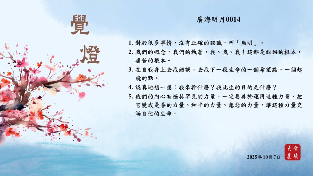 廣海明月0014 覺燈 (2025/10/07) Post author:大覺晨曦編輯組 Post published:2025/10/08 Post category:覺燈 1. 對於很多事情,沒有正確的認識,叫「無明」。2. 我們的概念,我們的執著,我、我、我!這都是錯誤的根本,痛苦的根本。3. 在自我身上去找錯誤,去找下一段生命的一個希望點、一個起飛的點。4. 認真地想一想:我來幹什麼?我此生的目的是什麼?5. 我們的內心有極其罕見的力量,一定要善於運用這種力量,把它變成是善的力量、和平的力量、慈悲的力量,讓這種力量充滿自他的生命。 累計閱覽數: 273 Read more articles Previous Post廣海明月0013 覺燈 (2025/10/06) Next Post廣海明月0015 覺燈 (2025/10/08)