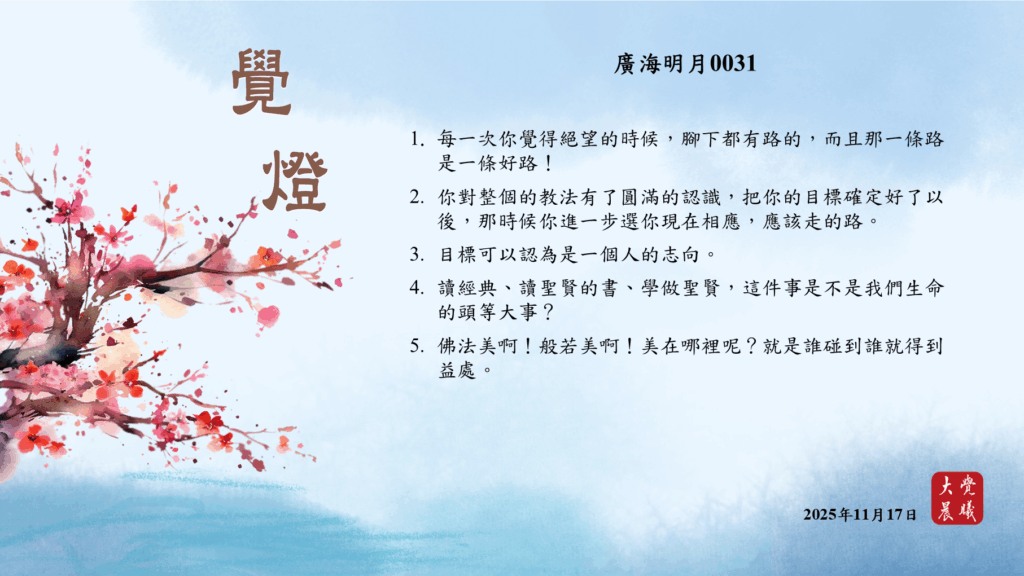 廣海明月0031 覺燈 (2025/11/17) Post author:大覺晨曦編輯組 Post published:2025/11/18 Post category:覺燈 1. 每一次你覺得絕望的時候,腳下都有路的,而且那一條路是一條好路!2. 你對整個的教法有了圓滿的認識,把你的目標確定好了以後,那時候你進一步選你現在相應,應該走的路。3. 目標可以認為是一個人的志向。4. 讀經典、讀聖賢的書、學做聖賢,這件事是不是我們生命的頭等大事?5. 佛法美啊!般若美啊!美在哪裡呢?就是誰碰到誰就得到益處。 累計閱覽數: 275 Read more articles Previous Post〈賢愚經業果故事──迦旃延教老母賣貧品、貧人夫婦疊施得現報品〉01 覺燈 (2025/11/16) Next Post廣海明月0032 覺燈 (2025/11/18)