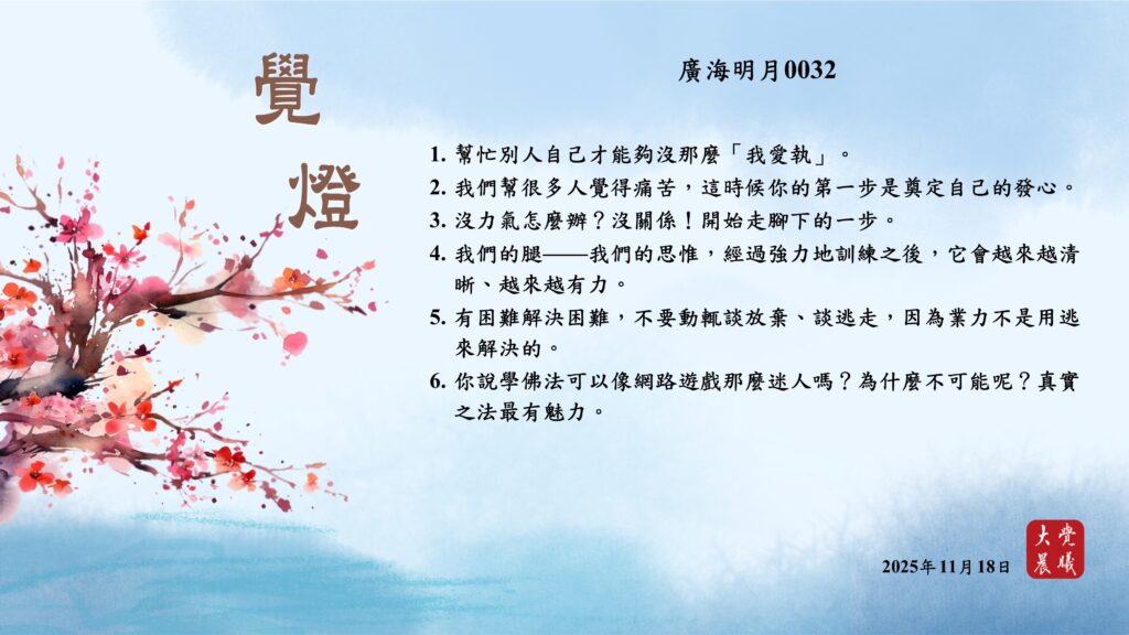 廣海明月0032 覺燈 (2025/11/18) Post author:大覺晨曦編輯組 Post published:2025/11/19 Post category:覺燈 1. 幫忙別人自己才能夠沒那麼「我愛執」。2. 我們幫很多人覺得痛苦,這時候你的第一步是奠定自己的發心。3. 沒力氣怎麼辦?沒關係!開始走腳下的一步。4. 我們的腿——我們的思惟,經過強力地訓練之後,它會越來越清晰、越來越有力。5. 有困難解決困難,不要動輒談放棄、談逃走,因為業力不是用逃來解決的。6. 你說學佛法可以像網路遊戲那麼迷人嗎?為什麼不可能呢?真實之法最有魅力。 累計閱覽數: 289 Read more articles Previous Post廣海明月0031 覺燈 (2025/11/17) Next Post廣海明月0033 覺燈 (2025/11/19)