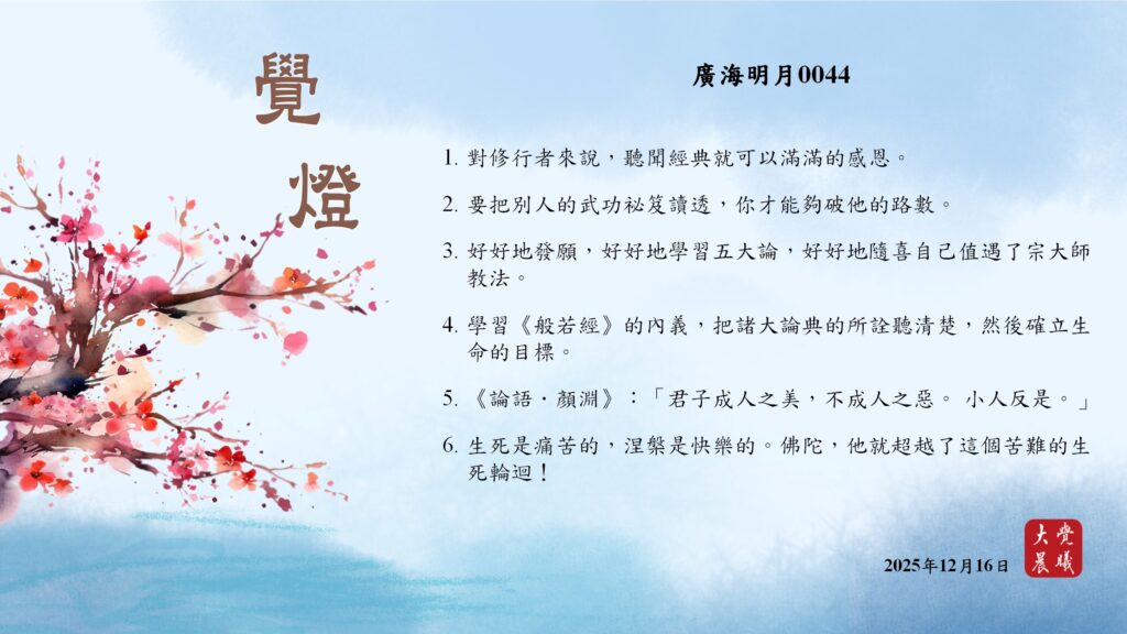 廣海明月0044 覺燈 (2025/12/16) Post author:大覺晨曦編輯組 Post published:2025/12/17 Post category:覺燈 1. 對修行者來說,聽聞經典就可以滿滿的感恩。2. 要把別人的武功祕笈讀透,你才能夠破他的路數。3. 好好地發願,好好地學習五大論,好好地隨喜自己值遇了宗大師教法。4. 學習《般若經》的內義,把諸大論典的所詮聽清楚,然後確立生命的目標。5. 《論語.顏淵》:「君子成人之美,不成人之惡。 小人反是。 」6. 生死是痛苦的,涅槃是快樂的。佛陀,他就超越了這個苦難的生死輪迴! 累計閱覽數: 263 Read more articles Previous Post廣海明月0043 覺燈 (2025/12/15) Next Post廣海明月0045 覺燈 (2025/12/17)