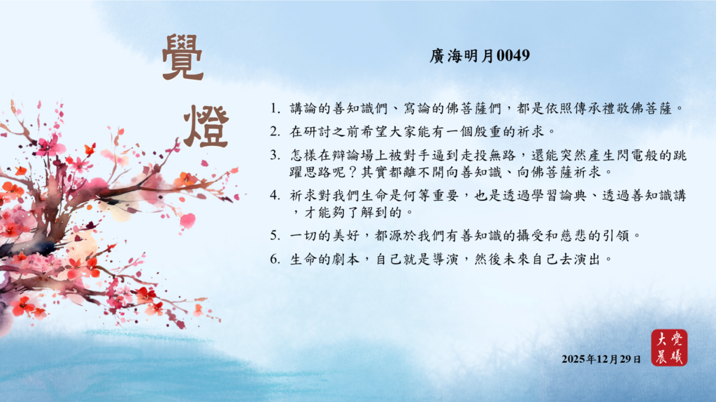 廣海明月0049 覺燈 (2025/12/29) Post author:大覺晨曦編輯組 Post published:2025/12/30 Post category:覺燈 1. 講論的善知識們、寫論的佛菩薩們,都是依照傳承禮敬佛菩薩。2. 在研討之前希望大家能有一個殷重的祈求。3. 怎樣在辯論場上被對手逼到走投無路,還能突然產生閃電般的跳躍思路呢?其實都離不開向善知識、向佛菩薩祈求。4. 祈求對我們生命是何等重要,也是透過學習論典、透過善知識講,才能夠了解到的。5. 一切的美好,都源於我們有善知識的攝受和慈悲的引領。6. 生命的劇本,自己就是導演,然後未來自己去演出。 累計閱覽數: 196 Read more articles Previous Post〈賢愚經業果故事──迦旃延教老母賣貧品、貧人夫婦疊施得現報品〉07 覺燈 (2025/12/28) Next Post廣海明月0050 覺燈 (2025/12/30)