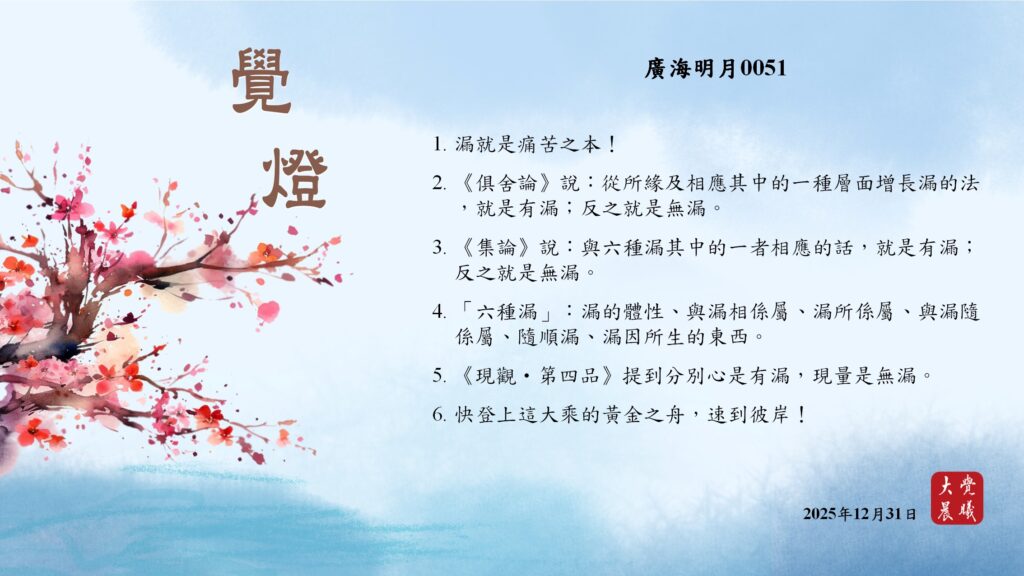 廣海明月0051 覺燈 (2025/12/31) Post author:大覺晨曦編輯組 Post published:2026/01/01 Post category:覺燈 1. 漏就是痛苦之本!2. 《俱舍論》說:從所緣及相應其中的一種層面增長漏的法,就是有漏;反之就是無漏。3. 《集論》說:與六種漏其中的一者相應的話,就是有漏;反之就是無漏。4. 「六種漏」:漏的體性、與漏相係屬、漏所係屬、與漏隨係屬、隨順漏、漏因所生的東西。5. 《現觀・第四品》提到分別心是有漏,現量是無漏。6. 快登上這大乘的黃金之舟,速到彼岸! 累計閱覽數: 222 Read more articles Previous Post廣海明月0050 覺燈 (2025/12/30) Next Post廣海明月0534 覺燈1 (2026/01/01)