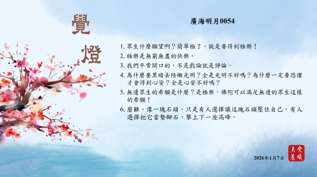廣海明月0054 覺燈 (2026/01/07) Post author:大覺晨曦編輯組 Post published:2026/01/08 Post category:覺燈 1. 眾生什麼願望啊?簡單極了,就是要得到極樂!2. 極樂是無窮無盡的快樂。3. 我們平常開口的,不是戲論就是諍論。4. 為什麼要黑暗去陪襯光明?全是光明不好嗎?為什麼一定要恐懼才會得到心安?全是心安不好嗎?5. 無邊眾生的希願是什麼?是極樂,佛陀可以滿足無邊的眾生這樣的希願!6. 磨難,像一塊石頭,只是有人選擇讓這塊石頭壓住自己,有人選擇把它當墊腳石,攀上下一座高峰。 累計閱覽數: 156 Read more articles Previous Post廣海明月0053 覺燈 (2026/01/06) Next Post廣海明月0535 覺燈1 (2026/01/08)