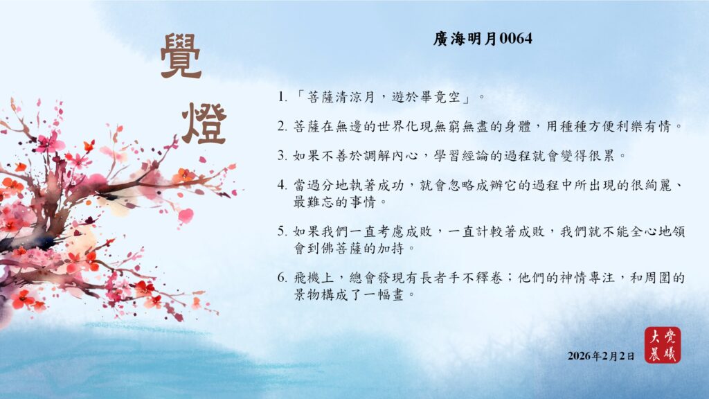 廣海明月0064 覺燈 (2026/02/02) Post author:大覺晨曦編輯組 Post published:2026/02/03 Post category:覺燈 1. 「菩薩清涼月,遊於畢竟空」。2. 菩薩在無邊的世界化現無窮無盡的身體,用種種方便利樂有情。3. 如果不善於調解內心,學習經論的過程就會變得很累。4. 當過分地執著成功,就會忽略成辦它的過程中所出現的很絢麗、最難忘的事情。5. 如果我們一直考慮成敗,一直計較著成敗,我們就不能全心地領會到佛菩薩的加持。6. 飛機上,總會發現有長者手不釋卷;他們的神情專注,和周圍的景物構成了一幅畫。 累計閱覽數: 135 Read more articles Previous Post〈中秋開示_決斷利他、發菩提心、點亮善行心燈〉05 覺燈 (2026/02/01) Next Post廣海明月0065 覺燈 (2026/02/03)