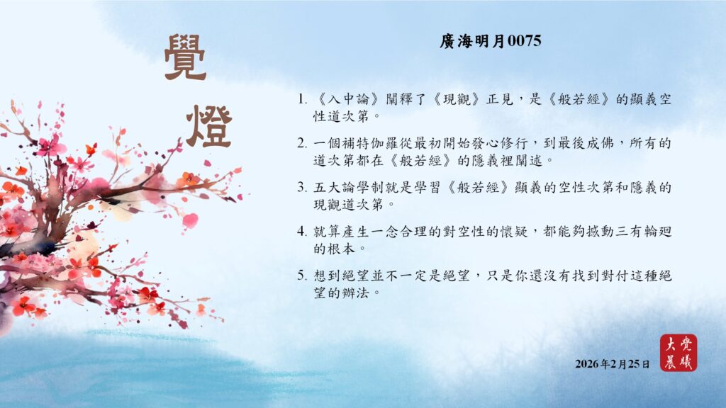 廣海明月0075 覺燈 (2026/02/25) Post author:大覺晨曦編輯組 Post published:2026/02/26 Post category:覺燈 1. 《入中論》闡釋了《現觀》正見,是《般若經》的顯義空性道次第。2. 一個補特伽羅從最初開始發心修行,到最後成佛,所有的道次第都在《般若經》的隱義裡闡述。3. 五大論學制就是學習《般若經》顯義的空性次第和隱義的現觀道次第。4. 就算產生一念合理的對空性的懷疑,都能夠撼動三有輪廻的根本。5. 想到絕望並不一定是絕望,只是你還沒有找到對付這種絕望的辦法。 累計閱覽數: 102 Read more articles Previous Post廣海明月0074 覺燈 (2026/02/24) Next Post廣海明月0541 覺燈3 (2026/02/26)
