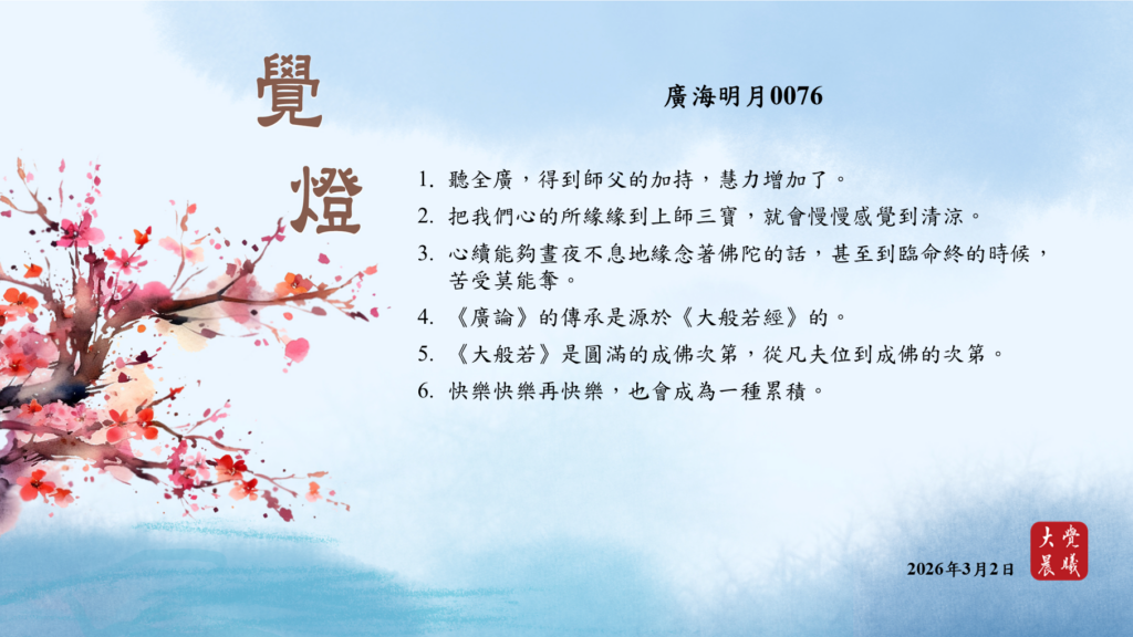 廣海明月0076 覺燈 (2026/03/02) Post author:大覺晨曦編輯組 Post published:2026/03/03 Post category:覺燈 1. 聽全廣,得到師父的加持,慧力增加了。2. 把我們心的所緣緣到上師三寶,就會慢慢感覺到清涼。3. 心續能夠晝夜不息地緣念著佛陀的話,甚至到臨命終的時候,苦受莫能奪。4. 《廣論》的傳承是源於《大般若經》的。5. 《大般若》是圓滿的成佛次第,從凡夫位到成佛的次第。6. 快樂快樂再快樂,也會成為一種累積。 累計閱覽數: 51 Read more articles Previous Post廣海明月0541 覺燈5 (2026/02/28) Next Post廣海明月0077 覺燈 (2026/03/03)