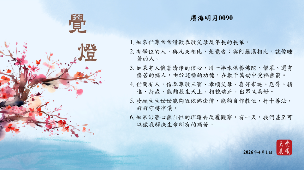 廣海明月0090 覺燈 (2026/04/01) Post author:大覺晨曦編輯組 Post published:2026/04/02 Post category:覺燈 1. 如來世尊常常讚歎恭敬父母及年長的長輩。2. 有學位的人,與凡夫相比,是覺者;與阿羅漢相比,就像睡著的人。3. 如果有人懷著清淨的信心,用一捧水供養佛陀、僧眾、還有痛苦的病人,由於這樣的功德,在數千萬劫中受福無窮。4. 世間有人,信奉尊敬三寶、孝順父母、喜好布施、忍辱、精進、持戒,能夠投生天上,相貌端正,出眾又美好。5. 發願生生世世能夠皈依佛法僧,能夠自作教他,行十善法,好好守持律儀。6. 如果沿著心無自性的理路去反覆觀察,有一天,我們甚至可以徹底解決生命所有的痛苦。 累計閱覽數: 113 Read more articles Previous Post廣海明月0089 覺燈 (2026/03/31) Next Post廣海明月0546 覺燈1 (2026/04/02)