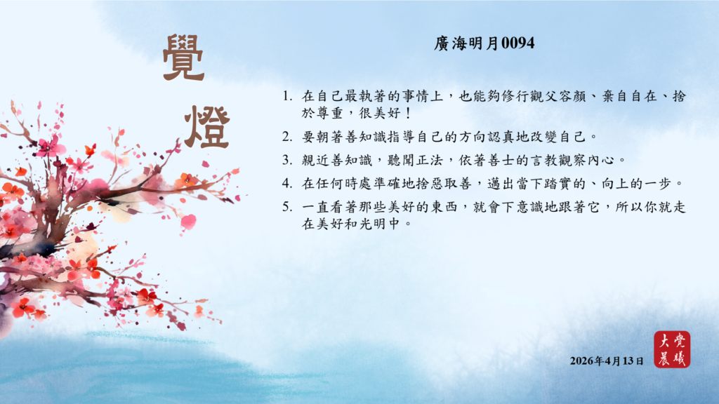 廣海明月0094 覺燈 (2026/04/13) Post author:大覺晨曦編輯組 Post published:2026/04/14 Post category:覺燈 1. 在自己最執著的事情上,也能夠修行觀父容顏、棄自自在、捨於尊重,很美好!2. 要朝著善知識指導自己的方向認真地改變自己。3. 親近善知識,聽聞正法,依著善士的言教觀察內心。4. 在任何時處準確地捨惡取善,邁出當下踏實的、向上的一步。5. 一直看著那些美好的東西,就會下意識地跟著它,所以你就走在美好和光明中。 累計閱覽數: 87 Read more articles Previous Post〈讓世界更美好──有機理念、感恩心〉2 覺燈 (2026/04/12) Next Post廣海明月0095 覺燈 (2026/04/14)