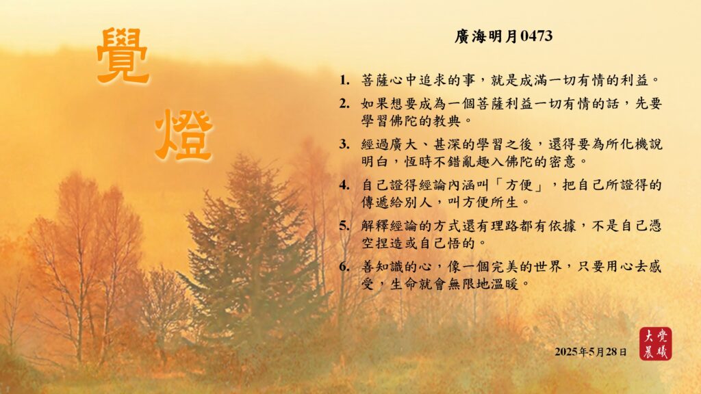 廣海明月0473 覺燈 (2025/05/28) Post author:大覺晨曦編輯組 Post published:2025/05/29 Post category:覺燈 1. 菩薩心中追求的事,就是成滿一切有情的利益。2. 如果想要成為一個菩薩利益一切有情的話,先要學習佛陀的教典。3. 經過廣大、甚深的學習之後,還得要為所化機說明白,恆時不錯亂趣入佛陀的密意。4. 自己證得經論內涵叫「方便」,把自己所證得的傳遞給別人,叫方便所生。5. 解釋經論的方式還有理路都有依據,不是自己憑空捏造或自己悟的。6. 善知識的心,像一個完美的世界,只要用心去感受,生命就會無限地溫暖。 累計閱覽數: 533 Read more articles Previous Post廣海明月0472 覺燈 (2025/05/27) Next Post廣海明月0474 覺燈 (2025/05/29)