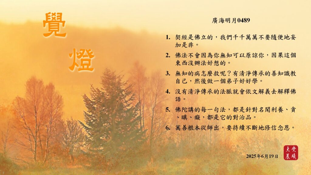 廣海明月0489 覺燈 (2025/06/19) Post author:大覺晨曦編輯組 Post published:2025/06/20 Post category:覺燈 1. 契經是佛立的,我們千千萬萬不要隨便地妄加是非。2. 佛法不會因為你無知可以原諒你,因果這個東西沒辦法好想的。3. 無知的病怎麼救呢?有清淨傳承的善知識教自己,然後做一個弟子好好學。4. 沒有清淨傳承的法脈就會依文解義去解釋佛語。5. 佛陀講的每一句法,都是針對名聞利養、貪、瞋、癡,都是它的對治品。6. 萬善根本從師出,要持續不斷地修信念恩。 累計閱覽數: 392 Read more articles Previous Post廣海明月0488 覺燈 (2025/06/18) Next Post廣海明月0490 覺燈 (2025/06/20)