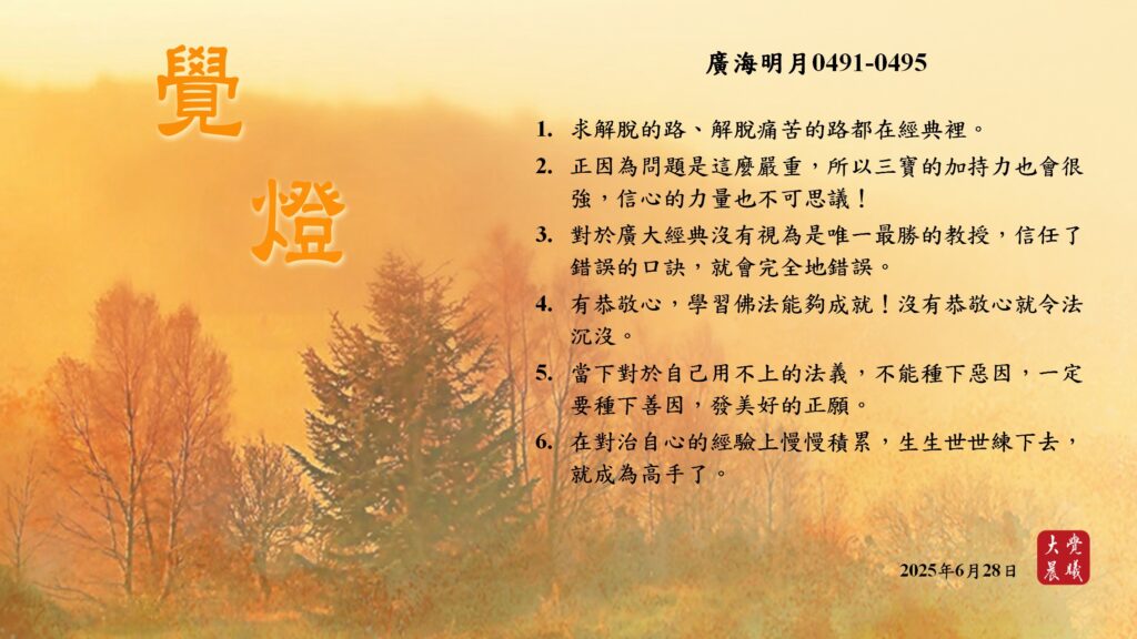 廣海明月0491-0495 覺燈 (2025/06/28) Post author:大覺晨曦編輯組 Post published:2025/06/29 Post category:覺燈 1. 求解脫的路、解脫痛苦的路都在經典裡。2.正因為問題是這麼嚴重,所以三寶的加持力也會很強,信心的力量也不可思議!3. 對於廣大經典沒有視為是唯一最勝的教授,信任了錯誤的口訣,就會完全地錯誤。4. 有恭敬心,學習佛法能夠成就!沒有恭敬心就令法沉沒。5. 當下對於自己用不上的法義,不能種下惡因,一定要種下善因,發美好的正願。6. 在對治自心的經驗上慢慢積累,生生世世練下去,就成為高手了。 累計閱覽數: 494 Read more articles Previous Post廣海明月0495 覺燈 (2025/06/27) Next Post〈居士提升營開示_聞法勝利(二)〉01 覺燈 (2025/06/29)