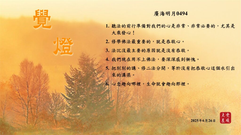 廣海明月0494 覺燈 (2025/06/26) Post author:大覺晨曦編輯組 Post published:2025/06/28 Post category:覺燈 1. 聽法的前行準備對我們的心是非常、非常必要的,尤其是大乘發心!2. 修學佛法最重要的,就是恭敬心。3. 法沉沒最主要的原因就是沒有恭敬。4. 我們現在用不上佛法,要深深感到慚愧。5. 把別別的講、修二法分開,等於沒有把恭敬心這個水引出來的溝渠。6. 心念趣向哪裡,生命就會趣向那裡。 累計閱覽數: 471 Read more articles Previous Post廣海明月0493 覺燈 (2025/06/25) Next Post廣海明月0495 覺燈 (2025/06/27)
