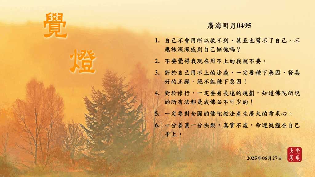 廣海明月0495 覺燈 (2025/06/27) Post author:大覺晨曦編輯組 Post published:2025/06/28 Post category:覺燈 1. 自己不會用所以救不到,甚至也幫不了自己,不應該深深感到自己慚愧嗎?2. 不要覺得我現在用不上的我就不要。3. 對於自己用不上的法義,一定要種下善因,發美好的正願,絕不能種下惡因!4. 對於修行,一定要有長遠的規劃,知道佛陀所說的所有法都是成佛必不可少的!5. 一定要對全圓的佛陀教法產生廣大的希求心。6. 一分善業一分快樂,真實不虛,命運就握在自己手上。 累計閱覽數: 496 Read more articles Previous Post廣海明月0494 覺燈 (2025/06/26) Next Post廣海明月0491-0495 覺燈 (2025/06/28)