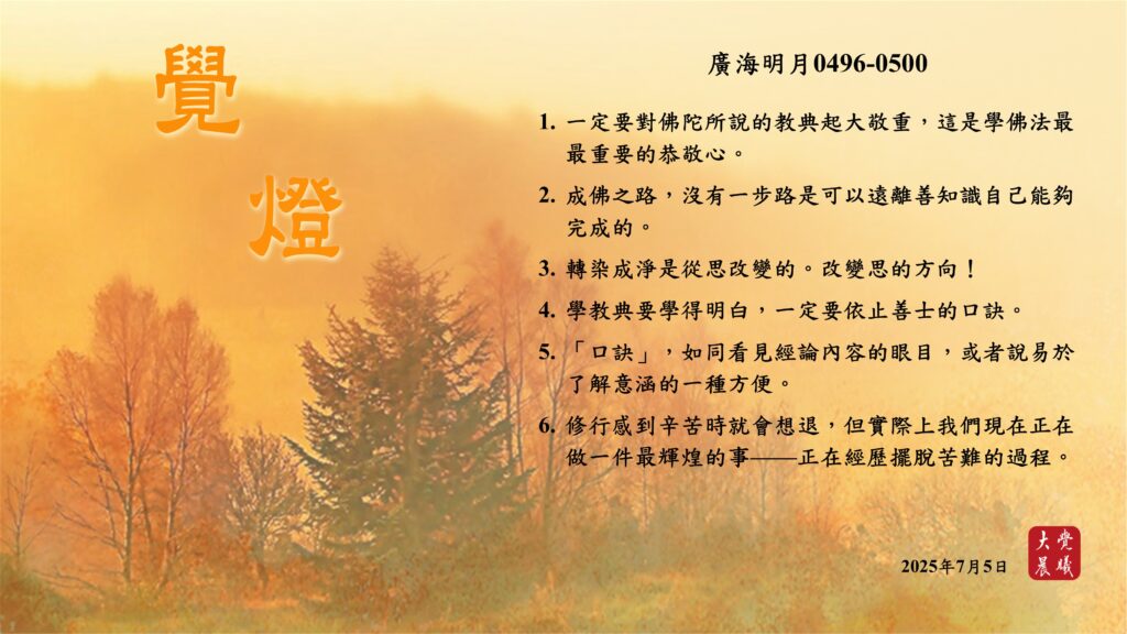 廣海明月0496-0500 覺燈 (2025/07/05) Post author:大覺晨曦編輯組 Post published:2025/07/06 Post category:覺燈 1. 一定要對佛陀所說的教典起大敬重,這是學佛法最最重要的恭敬心。2. 成佛之路,沒有一步路是可以遠離善知識自己能夠完成的。3. 轉染成淨是從思改變的。改變思的方向!4. 學教典要學得明白,一定要依止善士的口訣。5. 「口訣」,如同看見經論內容的眼目,或者說易於了解意涵的一種方便。6. 修行感到辛苦時就會想退,但實際上我們現在正在做一件最輝煌的事——正在經歷擺脫苦難的過程。 累計閱覽數: 370 Read more articles Previous Post廣海明月0500 覺燈 (2025/07/04) Next Post〈居士提升營開示_聞法勝利(二)〉02 覺燈 (2025/07/06)