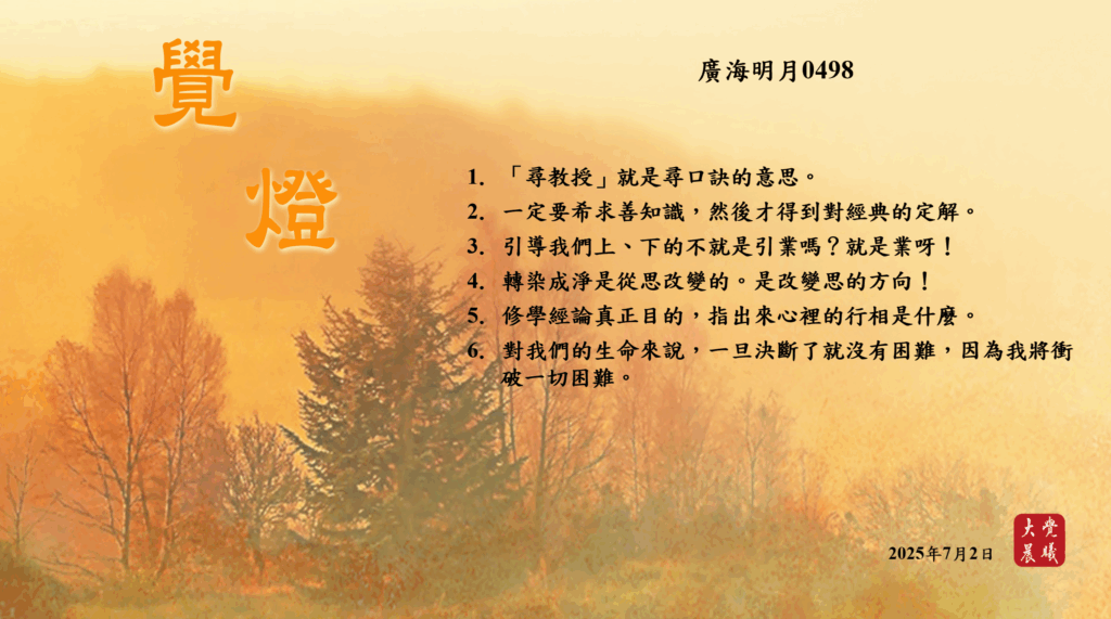 廣海明月0498 覺燈 (2025/07/02) Post author:大覺晨曦編輯組 Post published:2025/07/03 Post category:覺燈 1.「尋教授」就是尋口訣的意思。2. 一定要希求善知識,然後才得到對經典的定解。3. 引導我們上、下的不就是引業嗎?就是業呀!4. 轉染成淨是從思改變的。是改變思的方向!5. 修學經論真正目的,指出來心裡的行相是什麼。6. 對我們的生命來說,一旦決斷了就沒有困難,因為我將衝破一切困難。 累計閱覽數: 448 Read more articles Previous Post廣海明月0497 覺燈 (2025/07/01) Next Post廣海明月0499 覺燈 (2025/07/03)
