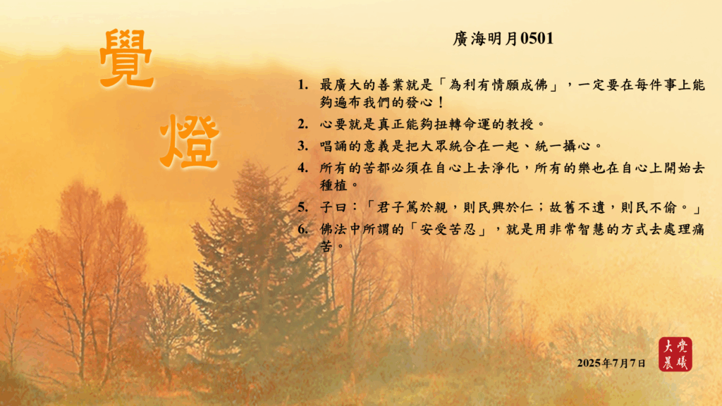 廣海明月0501 覺燈 (2025/07/07) Post author:大覺晨曦編輯組 Post published:2025/07/08 Post category:覺燈 1. 最廣大的善業就是「為利有情願成佛」,一定要在每件事上能夠遍布我們的發心!2. 心要就是真正能夠扭轉命運的教授。3. 唱誦的意義是把大眾統合在一起、統一攝心。4. 所有的苦都必須在自心上去淨化,所有的樂也在自心上開始去種植。5. 子曰:「君子篤於親,則民興於仁;故舊不遺,則民不偷。」6. 佛法中所謂的「安受苦忍」,就是用非常智慧的方式去處理痛苦。 累計閱覽數: 411 Read more articles Previous Post〈居士提升營開示_聞法勝利(二)〉02 覺燈 (2025/07/06) Next Post廣海明月0502 覺燈 (2025/07/08)