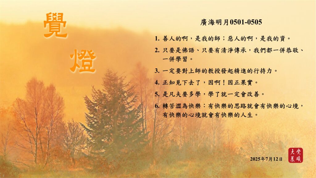 廣海明月0501-0505 覺燈 (2025/07/12) Post author:大覺晨曦編輯組 Post published:2025/07/13 Post category:覺燈 1. 善人的啊,是我的師;惡人的啊,是我的資。2. 只要是佛語、只要有清淨傳承,我們都一併恭敬、一併學習。3. 一定要對上師的教授發起精進的行持力。4. 正知見下去了,因啊!因正果實。5. 是凡夫要多學,學了就一定會改善。6. 轉苦澀為快樂:有快樂的思路就會有快樂的心境,有快樂的心境就會有快樂的人生。 累計閱覽數: 430 Read more articles Previous Post廣海明月0505 覺燈 (2025/07/11) Next Post〈居士提升營開示_聞法勝利(二)〉03 覺燈 (2025/07/13)