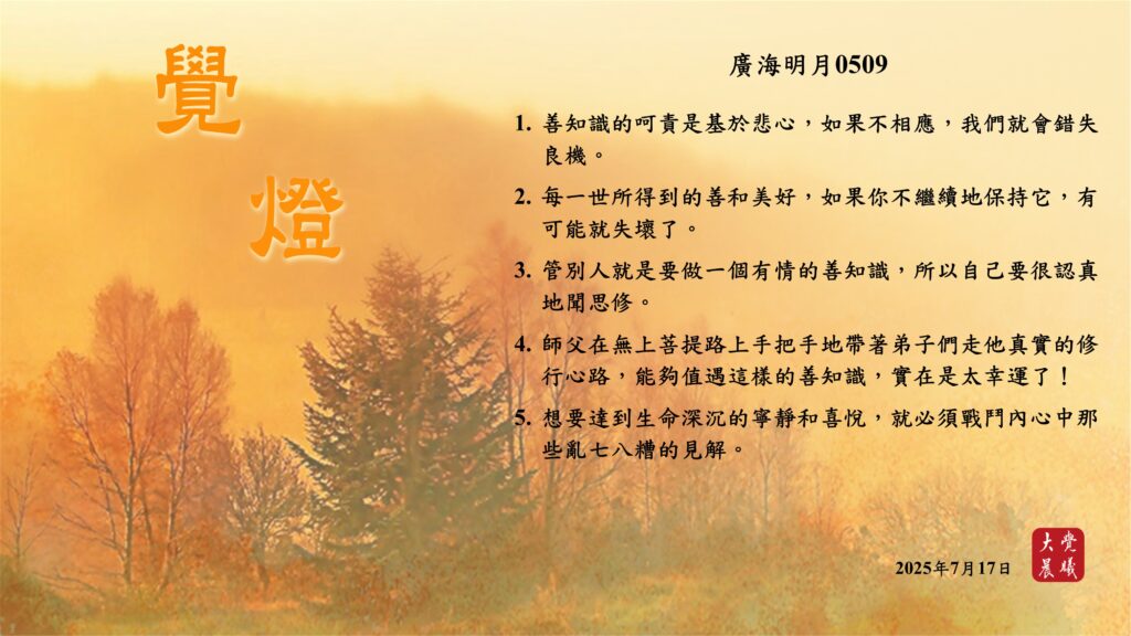 廣海明月0509 覺燈 (2025/07/17) Post author:大覺晨曦編輯組 Post published:2025/07/19 Post category:覺燈 1. 善知識的呵責是基於悲心,如果不相應,我們就會錯失良機。2. 每一世所得到的善和美好,如果你不繼續地保持它,有可能就失壞了。3. 管別人就是要做一個有情的善知識,所以自己要很認真地聞思修。4. 師父在無上菩提路上手把手地帶著弟子們走他真實的修行心路,能夠值遇這樣的善知識,實在是太幸運了!5. 想要達到生命深沉的寧靜和喜悅,就必須戰鬥內心中那些亂七八糟的見解。 累計閱覽數: 427 Read more articles Previous Post廣海明月0508 覺燈 (2025/07/16) Next Post廣海明月0510 覺燈 (2025/07/18)