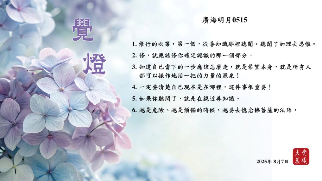 廣海明月0515 覺燈1 (2025/08/07) Post author:大覺晨曦編輯組 Post published:2025/08/08 Post category:覺燈 1. 修行的次第,第一個,從善知識那裡聽聞。聽聞了如理去思惟。2. 修,就應該修你確定認識的那一個部分。3. 知道自己當下的一步應該怎麼走,就是希望本身,就是所有人都可以振作地活一把的力量的源泉!4. 一定要清楚自己現在是在哪裡,這件事很重要!5. 如果你聽聞了,就是在親近善知識。6. 越是危險、越是煩惱的時候,越要去憶念佛菩薩的法語。 累計閱覽數: 490 Read more articles Previous Post道次第略義淺釋05 覺燈 (2025/08/06) Next Post廣海明月0515 覺燈2 (2025/08/08)