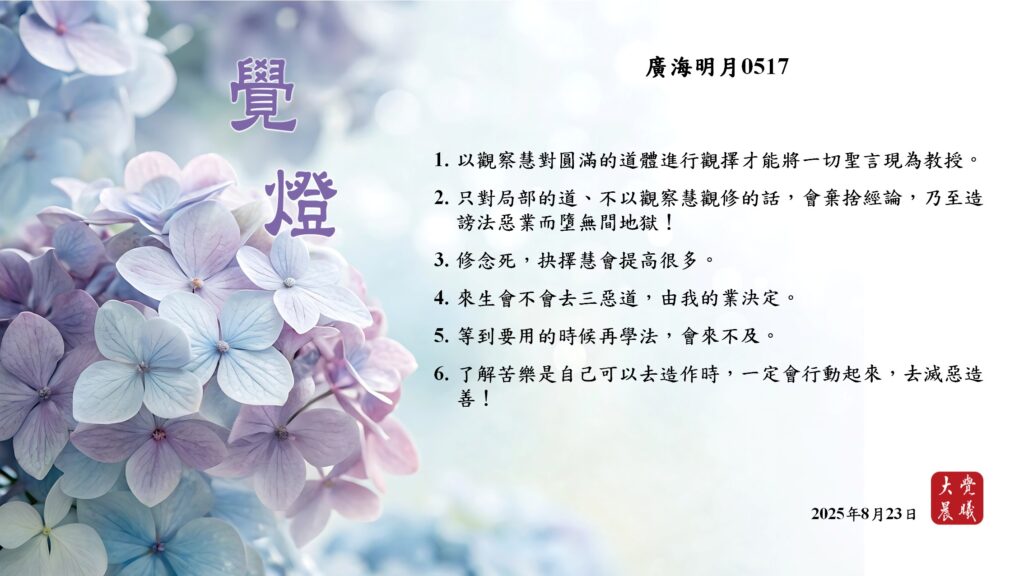 廣海明月0517 覺燈3 (2025/08/23) Post author:大覺晨曦編輯組 Post published:2025/08/24 Post category:覺燈 1. 以觀察慧對圓滿的道體進行觀擇才能將一切聖言現為教授。2. 只對局部的道、不以觀察慧觀修的話,會棄捨經論,乃至造謗法惡業而墮無間地獄!3. 修念死,抉擇慧會提高很多。4. 來生會不會去三惡道,由我的業決定。5. 等到要用的時候再學法,會來不及。6. 了解苦樂是自己可以去造作時,一定會行動起來,去滅惡造善! 累計閱覽數: 473 Read more articles Previous Post廣海明月0517 覺燈2 (2025/08/22) Next Post居士提升營開示_聞法勝利(二)〉09 覺燈 (2025/08/24)