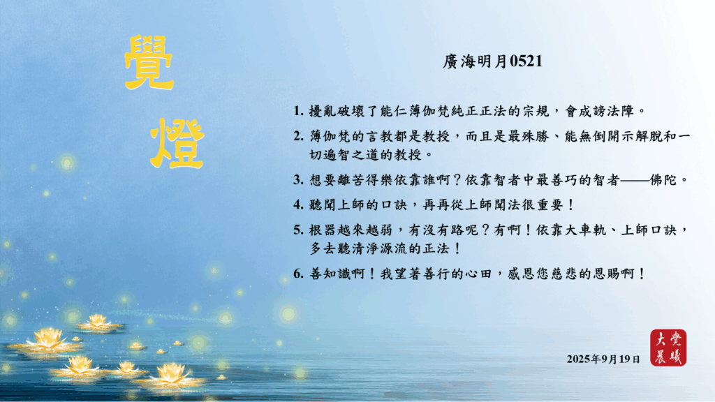 廣海明月0521 覺燈1 (2025/09/19) Post author:大覺晨曦編輯組 Post published:2025/09/20 Post category:覺燈 1. 擾亂破壞了能仁薄伽梵純正正法的宗規,會成謗法障。2. 薄伽梵的言教都是教授,而且是最殊勝、能無倒開示解脫和一切遍智之道的教授。3. 想要離苦得樂依靠誰啊?依靠智者中最善巧的智者——佛陀。4. 聽聞上師的口訣,再再從上師聞法很重要!5. 根器越來越弱,有沒有路呢?有啊!依靠大車軌、上師口訣,多去聽清淨源流的正法!6. 善知識啊!我望著善行的心田,感恩您慈悲的恩賜啊! 累計閱覽數: 441 Read more articles Previous Post廣海明月0520 覺燈4 (2025/09/18) Next Post廣海明月0521 覺燈2 (2025/09/20)