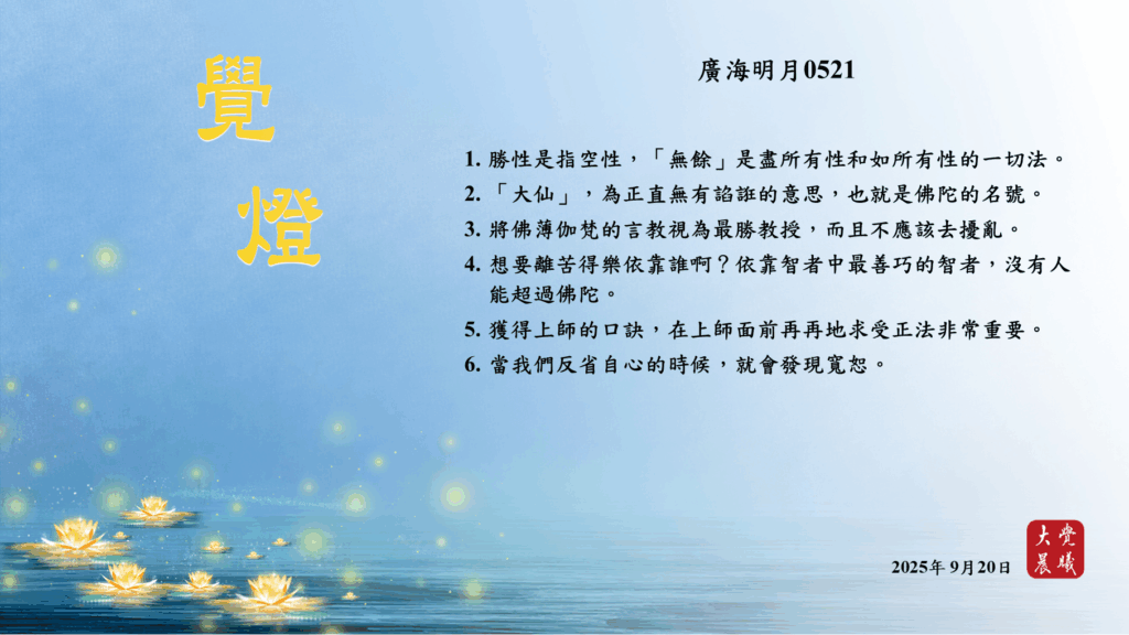 廣海明月0521 覺燈2 (2025/09/20) Post author:大覺晨曦編輯組 Post published:2025/09/21 Post category:覺燈 1. 勝性是指空性,「無餘」是盡所有性和如所有性的一切法。2. 「大仙」,為正直無有諂誑的意思,也就是佛陀的名號。3. 將佛薄伽梵的言教視為最勝教授,而且不應該去擾亂。4. 想要離苦得樂依靠誰啊?依靠智者中最善巧的智者,沒有人能超過佛陀。5. 獲得上師的口訣,在上師面前再再地求受正法非常重要。6. 當我們反省自心的時候,就會發現寬恕。 累計閱覽數: 309 Read more articles Previous Post廣海明月0521 覺燈1 (2025/09/19) Next Post〈辯論營開示──懷著希望的理路而活,向憂鬱宣戰〉03 覺燈 (2025/09/21)