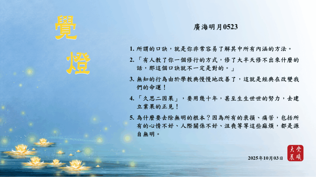 廣海明月0523 覺燈2 (2025/10/03) Post author:大覺晨曦編輯組 Post published:2025/10/04 Post category:覺燈 1. 所謂的口訣,就是你非常容易了解其中所有內涵的方法。2. 「有人教了你一個修行的方式,修了大半天修不出來什麼的話,那這個口訣就不一定是對的。」3. 無知的行為由於學教典慢慢地改善了,這就是經典在改變我們的命運!4. 「久思二因果」,要用幾十年,甚至生生世世的努力,去建立業果的正見!5. 為什麼要去除無明的根本?因為所有的衰損、痛苦,包括所有的心情不好、人際關係不好、沮喪等等這些麻煩,都是源自無明。 累計閱覽數: 442 Read more articles Previous Post廣海明月0523 覺燈1 (2025/10/02) Next Post廣海明月0523 覺燈3 (2025/10/04)