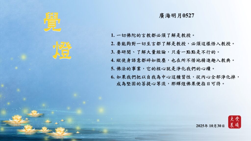 廣海明月0527 覺燈1 (2025/10/30) Post author:大覺晨曦編輯組 Post published:2025/10/31 Post category:覺燈 1. 一切佛陀的言教都必須了解是教授。2. 要能夠對一切至言都了解是教授,必須這樣悟入教授。3. 要研閱、了解大量經論,只看一點點是不行的。4. 縱使身語意都碎如微塵,也在所不惜地精進趣入教典。5. 佛法的事業,它的核心就是淨化我們的心續。6. 如果我們把以自我為中心這種習性,從內心全部淨化掉,成為堅固的菩提心等流,那輝煌佛果便指日可待。 累計閱覽數: 1,070 Read more articles Previous Post廣海明月0024 覺燈 (2025/10/29) Next Post廣海明月0527 覺燈2 (2025/10/31)