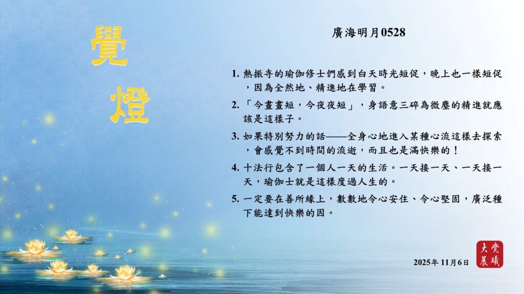 廣海明月0528 覺燈1 (2025/11/06) Post author:大覺晨曦編輯組 Post published:2025/11/07 Post category:覺燈 1. 熱振寺的瑜伽修士們感到白天時光短促,晚上也一樣短促,因為全然地、精進地在學習。2. 「今晝晝短,今夜夜短」,身語意三碎為微塵的精進就應該是這樣子。3. 如果特別努力的話——全身心地進入某種心流這樣去探索,會感覺不到時間的流逝,而且也是滿快樂的!4. 十法行包含了一個人一天的生活。一天接一天、一天接一天,瑜伽士就是這樣度過人生的。5. 一定要在善所緣上,數數地令心安住、令心堅固,廣泛種下能達到快樂的因。 累計閱覽數: 512 Read more articles Previous Post廣海明月0027 覺燈 (2025/11/05) Next Post廣海明月0528 覺燈2 (2025/11/07)