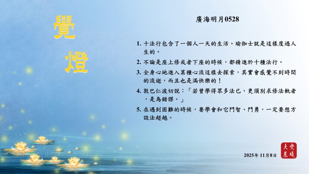 廣海明月0528 覺燈3 (2025/11/08) Post author:大覺晨曦編輯組 Post published:2025/11/09 Post category:覺燈 1. 十法行包含了一個人一天的生活。瑜伽士就是這樣度過人生的。2. 不論是座上修或者下座的時候,都精進於十種法行。3. 全身心地進入某種心流這樣去探索,其實會感覺不到時間的流逝,而且也是滿快樂的!4. 敦巴仁波切說:「若曾學得眾多法已,更須別求修法軌者,是為錯謬。」5. 在遇到困難的時候,要學會和它鬥智、鬥勇,一定要想方設法超越。 累計閱覽數: 396 Read more articles Previous Post廣海明月0528 覺燈2 (2025/11/07) Next Post〈居士佛學院第十期結業式──推動共下士道實修課〉02 覺燈 (2025/11/09)