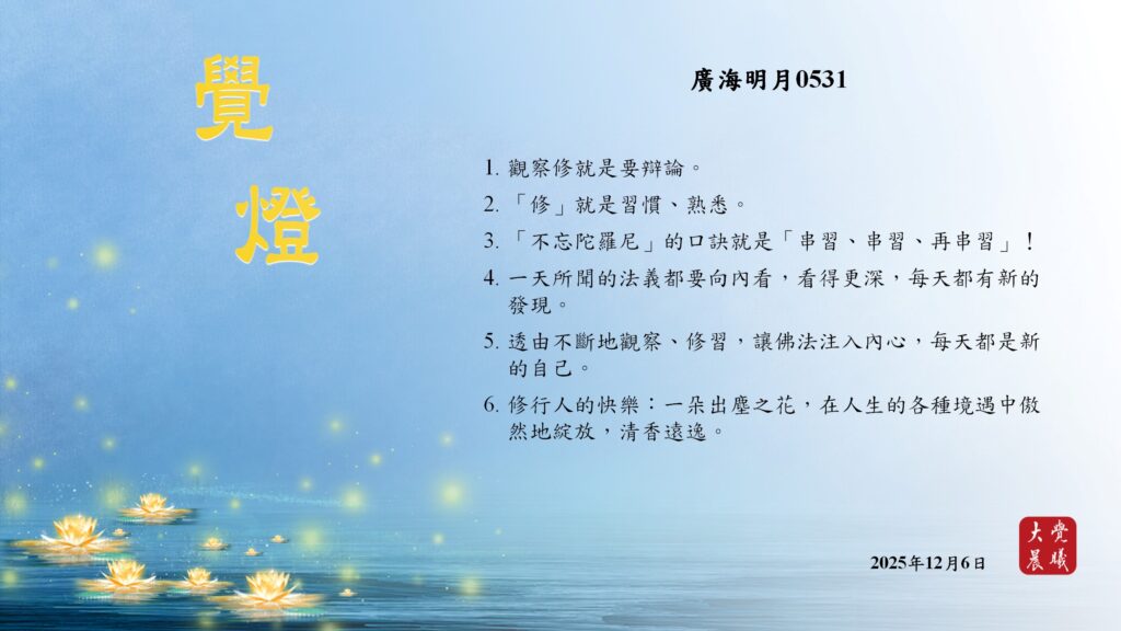 廣海明月0531 覺燈3 (2025/12/06) Post author:大覺晨曦編輯組 Post published:2025/12/07 Post category:覺燈 1. 觀察修就是要辯論。2. 「修」就是習慣、熟悉。3. 「不忘陀羅尼」的口訣就是「串習、串習、再串習」!4. 一天所聞的法義都要向內看,看得更深,每天都有新的發現。5. 透由不斷地觀察、修習,讓佛法注入內心,每天都是新的自己。6. 修行人的快樂:一朵出塵之花,在人生的各種境遇中傲然地綻放,清香遠逸。 累計閱覽數: 548 Read more articles Previous Post廣海明月0531 覺燈2 (2025/12/05) Next Post〈賢愚經業果故事──迦旃延教老母賣貧品、貧人夫婦疊施得現報品〉04 覺燈 (2025/12/07)