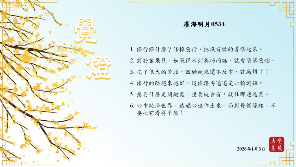 廣海明月0534 覺燈3 (2026/01/03) Post author:大覺晨曦編輯組 Post published:2026/01/05 Post category:覺燈 1. 修行修什麼?修掉惡行,把沒有做的善修起來。2. 對於業果見,如果得不到善巧的話,就會墮落惡趣。3. 吃了很大的苦頭,回過頭來還不反省,就麻煩了!4. 修行的路越來越好,這條路再遠還是比輪迴短。5. 想要什麼是關鍵處,想要就會有,就往那邊造業。6. 心中純淨世界,透過心造作出來。面對每個緣起,不要把它看得平庸! 累計閱覽數: 315 Read more articles Previous Post廣海明月0534 覺燈2 (2026/01/02) Next Post廣海明月0052 覺燈 (2026/01/05)