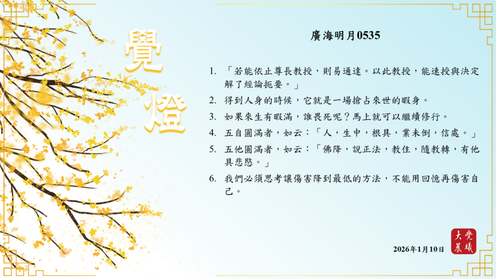 廣海明月0535 覺燈3 (2026/01/10) Post author:大覺晨曦編輯組 Post published:2026/01/11 Post category:覺燈 1. 「若能依止尊長教授,則易通達。以此教授,能速授與決定解了經論扼要。」2. 得到人身的時候,它就是一場搶占來世的暇身。3. 如果來生有暇滿,誰畏死呢?馬上就可以繼續修行。4. 五自圓滿者,如云:「人,生中,根具,業未倒,信處。」5. 五他圓滿者,如云:「佛降,說正法,教住,隨教轉,有他具悲愍。」6. 我們必須思考讓傷害降到最低的方法,不能用回憶再傷害自己。 累計閱覽數: 366 Read more articles Previous Post廣海明月0535 覺燈2 (2026/01/09) Next Post〈中秋開示_決斷利他、發菩提心、點亮善行心燈〉02 覺燈 (2026/01/11)