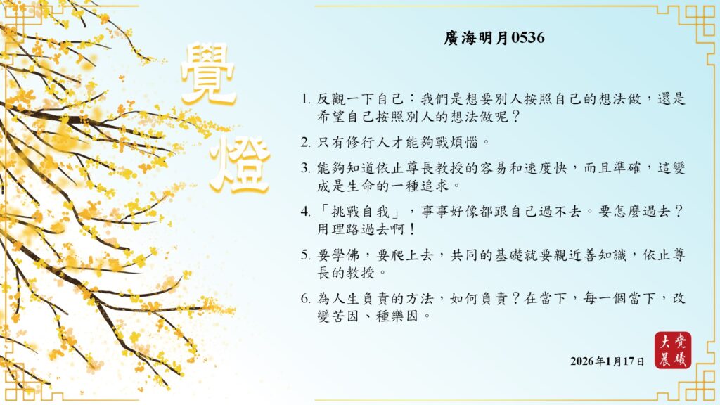 廣海明月0536 覺燈3 (2026/01/17) Post author:大覺晨曦編輯組 Post published:2026/01/18 Post category:覺燈 1. 反觀一下自己:我們是想要別人按照自己的想法做,還是希望自己按照別人的想法做呢?2. 只有修行人才能夠戰煩惱。3. 能夠知道依止尊長教授的容易和速度快,而且準確,這變成是生命的一種追求。4. 「挑戰自我」,事事好像都跟自己過不去。要怎麼過去?用理路過去啊!5. 要學佛,要爬上去,共同的基礎就要親近善知識,依止尊長的教授。6. 為人生負責的方法,如何負責?在當下,每一個當下,改變苦因、種樂因。 累計閱覽數: 330 Read more articles Previous Post廣海明月0536 覺燈2 (2026/01/16) Next Post〈中秋開示_決斷利他、發菩提心、點亮善行心燈〉03 覺燈 (2026/01/18)