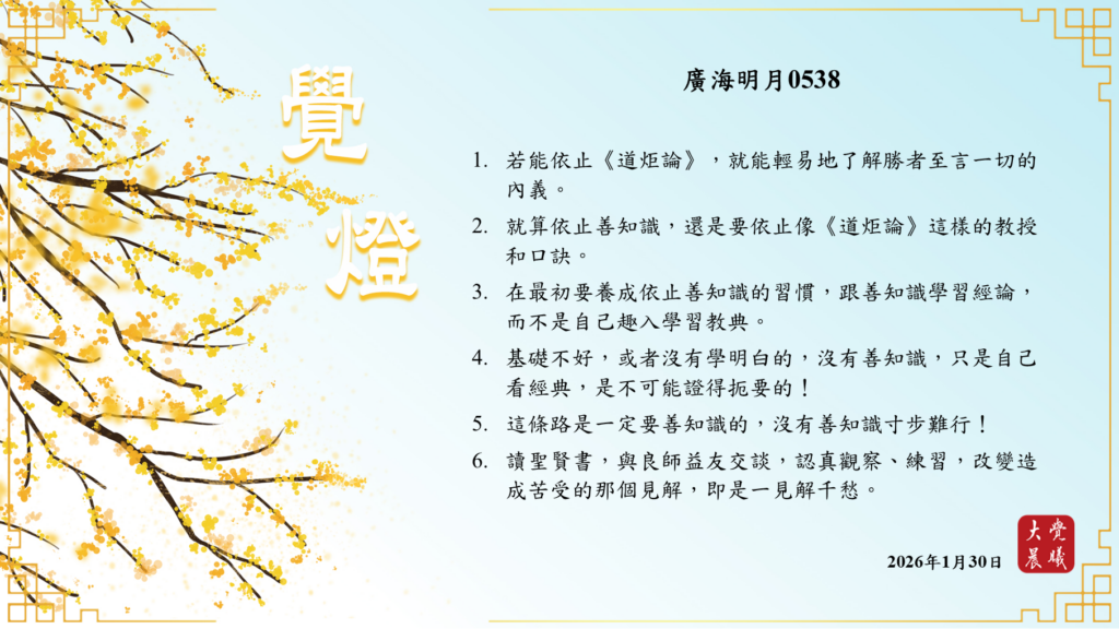 廣海明月0538 覺燈1 (2026/01/30) Post author:大覺晨曦編輯組 Post published:2026/01/31 Post category:覺燈 1. 若能依止《道炬論》,就能輕易地了解勝者至言一切的內義。2. 就算依止善知識,還是要依止像《道炬論》這樣的教授和口訣。3. 在最初要養成依止善知識的習慣,跟善知識學習經論,而不是自己趣入學習教典。4. 基礎不好,或者沒有學明白的,沒有善知識,只是自己看經典,是不可能證得扼要的!5. 這條路是一定要善知識的,沒有善知識寸步難行!6. 讀聖賢書,與良師益友交談,認真觀察、練習,改變造成苦受的那個見解,即是一見解千愁。 累計閱覽數: 342 Read more articles Previous Post廣海明月0537 覺燈4 (2026/01/29) Next Post廣海明月0538 覺燈2 (2026/01/31)