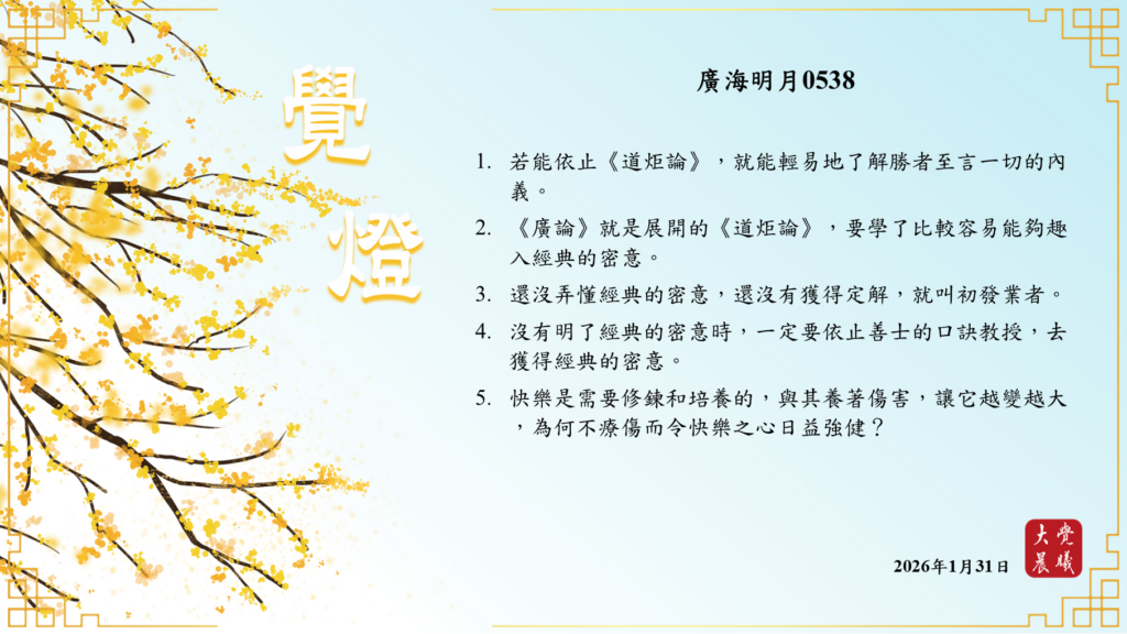 廣海明月0538 覺燈2 (2026/01/31) Post author:大覺晨曦編輯組 Post published:2026/02/01 Post category:覺燈 1. 若能依止《道炬論》,就能輕易地了解勝者至言一切的內義。2. 《廣論》就是展開的《道炬論》,要學了比較容易能夠趣入經典的密意。3. 還沒弄懂經典的密意,還沒有獲得定解,就叫初發業者。4. 沒有明了經典的密意時,一定要依止善士的口訣教授,去獲得經典的密意。5. 快樂是需要修鍊和培養的,與其養著傷害,讓它越變越大,為何不療傷而令快樂之心日益強健? 累計閱覽數: 354 Read more articles Previous Post廣海明月0538 覺燈1 (2026/01/30) Next Post〈中秋開示_決斷利他、發菩提心、點亮善行心燈〉05 覺燈 (2026/02/01)