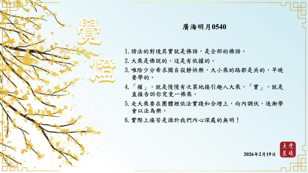 廣海明月0540 覺燈4 (2026/02/19) Post author:大覺晨曦編輯組 Post published:2026/02/20 Post category:覺燈 1. 謗法的對境其實就是佛語,是全部的佛語。2. 大乘是佛說的,這是有依據的。3. 唯除少分希求獨自寂靜快樂,大小乘的路都是共的,早晚要學的。4. 「權」,就是慢慢有次第地接引趣入大乘,『實』,就是直接告訴你究竟一佛乘。5. 走大乘要在團體裡依法實踐和合增上,向內調伏,逐漸學會以法為樂。6. 實際上痛苦是源於我們內心深處的無明! 累計閱覽數: 242 Read more articles Previous Post廣海明月0072 覺燈 (2026/02/18) Next Post廣海明月0541 覺燈1 (2026/02/20)