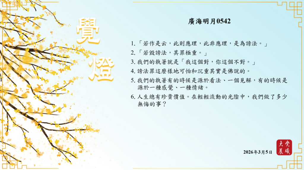 廣海明月0542 覺燈1 (2026/03/05) Post author:大覺晨曦編輯組 Post published:2026/03/06 Post category:覺燈 1. 「若作是云,此則應理,此非應理,是為謗法。」2. 「若毀謗法,其罪極重。」3. 我們的執著就是「我這個對,你這個不對。」4. 謗法罪這麼樣地可怕和沉重其實是佛說的。5. 我們的執著有的時候是源於看法、一個見解,有的時候是源於一種感覺、一種情緒。6. 人生總有珍貴價值。在輕輕流動的光陰中,我們做了多少無悔的事? 累計閱覽數: 52 Read more articles Previous Post廣海明月0078 覺燈 (2026/03/04)