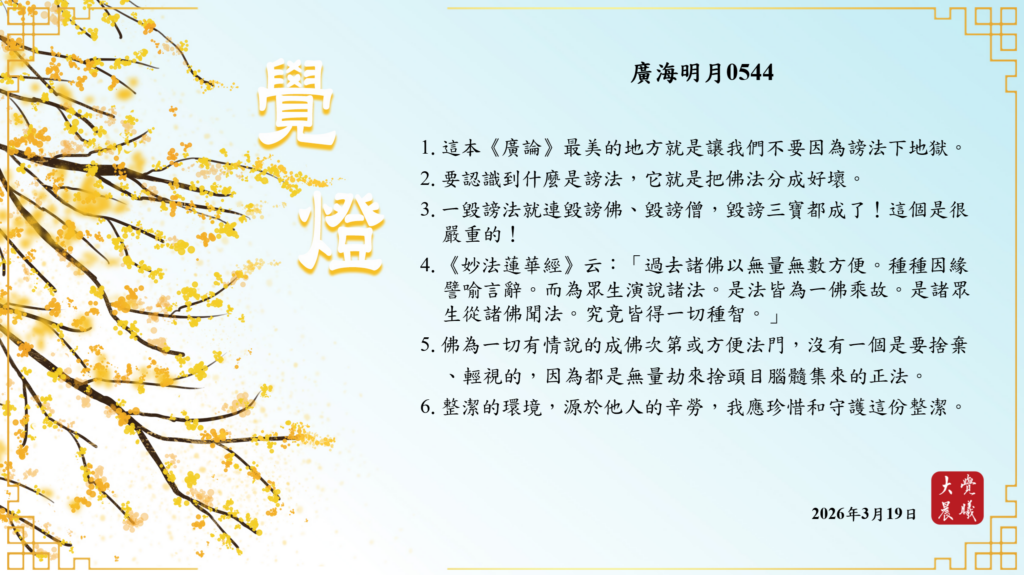 廣海明月0544 覺燈1 (2026/03/19) Post author:大覺晨曦編輯組 Post published:2026/03/20 Post category:覺燈 1. 這本《廣論》最美的地方就是讓我們不要因為謗法下地獄。2. 要認識到什麼是謗法,它就是把佛法分成好壞。3. 一毀謗法就連毀謗佛、毀謗僧,毀謗三寶都成了!這個是很嚴重的!4. 《妙法蓮華經》云:「過去諸佛以無量無數方便。種種因緣譬喻言辭。而為眾生演說諸法。是法皆為一佛乘故。是諸眾生從諸佛聞法。究竟皆得一切種智。」5. 佛為一切有情說的成佛次第或方便法門,沒有一個是要捨棄、輕視的,因為都是無量劫來捨頭目腦髓集來的正法。6. 整潔的環境,源於他人的辛勞,我應珍惜和守護這份整潔。 累計閱覽數: 513 Read more articles Previous Post廣海明月0084 覺燈 (2026/03/18) Next Post廣海明月0544 覺燈2 (2026/03/20)