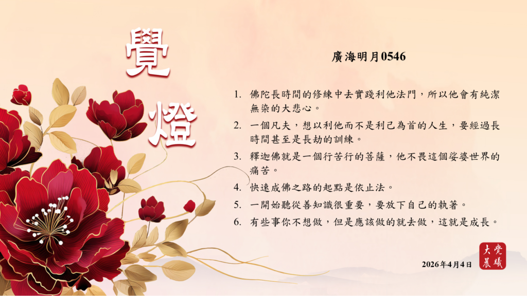 廣海明月0546 覺燈3 (2026/04/04) Post author:大覺晨曦編輯組 Post published:2026/04/05 Post category:覺燈 1. 佛陀長時間的修練中去實踐利他法門,所以他會有純潔無染的大悲心。2. 一個凡夫,想以利他而不是利己為首的人生,要經過長時間甚至是長劫的訓練。3. 釋迦佛就是一個行苦行的菩薩,他不畏這個娑婆世界的痛苦。4. 快速成佛之路的起點是依止法。5. 一開始聽從善知識很重要,要放下自己的執著。6. 有些事你不想做,但是應該做的就去做,這就是成長。 累計閱覽數: 379 Read more articles Previous Post廣海明月0546 覺燈2 (2026/04/03) Next Post〈讓世界更美好──有機理念、感恩心〉1 覺燈 (2026/04/05)