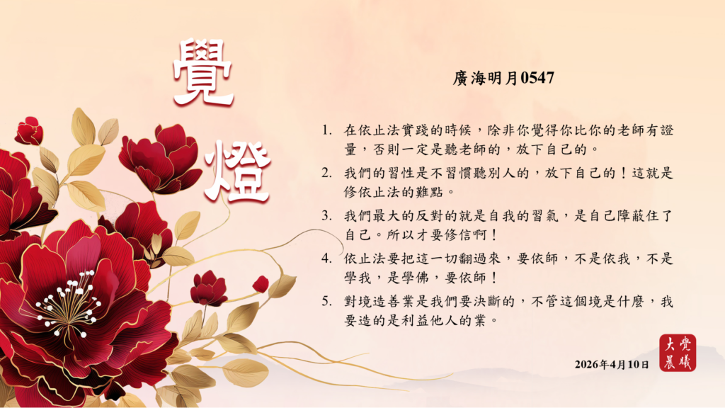 廣海明月0547 覺燈2 (2026/04/10) Post author:大覺晨曦編輯組 Post published:2026/04/11 Post category:覺燈 1. 在依止法實踐的時候,除非你覺得你比你的老師有證量,否則一定是聽老師的,放下自己的。2. 我們的習性是不習慣聽別人的,放下自己的!這就是修依止法的難點。3. 我們最大的反對的就是自我的習氣,是自己障蔽住了自己。所以才要修信啊!4. 依止法要把這一切翻過來,要依師,不是依我,不是學我,是學佛,要依師!5. 對境造善業是我們要決斷的,不管這個境是什麼,我要造的是利益他人的業。 累計閱覽數: 221 Read more articles Previous Post廣海明月0547 覺燈1 (2026/04/09) Next Post廣海明月0547 覺燈3 (2026/04/11)