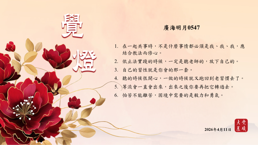 廣海明月0547 覺燈3 (2026/04/11) Post author:大覺晨曦編輯組 Post published:2026/04/12 Post category:覺燈 1. 在一起共事時,不是什麼事情都必須是我、我、我,應結合教法而修心。2. 依止法實踐的時候,一定是聽老師的,放下自己的。3. 自己的習性就是你會的那一套。4. 聽的時候很開心,一做的時候就又跑回到老習慣去了。5. 等流會一直會出來,出來之後你要再把它轉過去。6. 怕苦不能離苦,困境中需要的是毅力和勇氣。 累計閱覽數: 222 Read more articles Previous Post廣海明月0547 覺燈2 (2026/04/10) Next Post〈讓世界更美好──有機理念、感恩心〉2 覺燈 (2026/04/12)