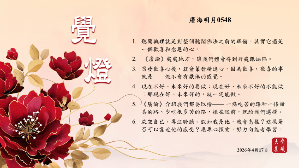 廣海明月0548 覺燈2 (2026/04/17) Post author:大覺晨曦編輯組 Post published:2026/04/19 Post category:覺燈 1. 聽聞軌理就是對整個聽聞佛法之前的準備,其實它還是一個歡喜和念恩的心。2. 《廣論》處處地方,讓我們體會得到好處跟缺陷。3. 策發歡喜心後,就會策發精進心,因為歡喜,歡喜的事就是 ── 做不會有厭倦的感覺。4. 現在不好、未來好的要做;現在好、未來不好的不能做;那現在好、未來好的,就一定能做。5. 《廣論》介紹我們都要取捨 ── 一條吃苦的路和一條甜美的路、少吃很多苦的路,擺在眼前,就給我們選擇。6. 放空自己,專注聆聽。假如我是他,我會怎樣?這樣是否可以靠近他的感受?應專心探索,努力向能者學習。 累計閱覽數: 121 Read more articles Previous Post廣海明月0548 覺燈1 (2026/04/16) Next Post廣海明月0548 覺燈3 (2026/04/18)