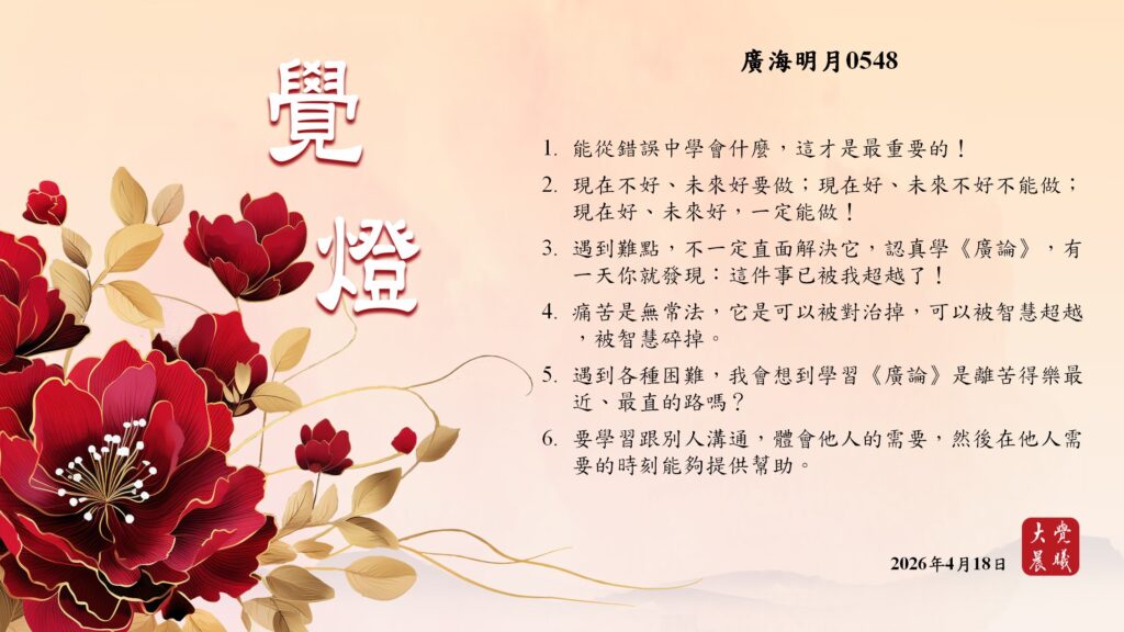 廣海明月0548 覺燈3 (2026/04/18) Post author:大覺晨曦編輯組 Post published:2026/04/19 Post category:覺燈 1. 能從錯誤中學會什麼,這才是最重要的!2. 現在不好、未來好要做;現在好、未來不好不能做;現在好、未來好,一定能做!3. 遇到難點,不一定直面解決它,認真學《廣論》,有一天你就發現:這件事已被我超越了!4. 痛苦是無常法,它是可以被對治掉,可以被智慧超越,被智慧碎掉。5. 遇到各種困難,我會想到學習《廣論》是離苦得樂最近、最直的路嗎?6. 要學習跟別人溝通,體會他人的需要,然後在他人需要的時刻能夠提供幫助。 累計閱覽數: 159 Read more articles Previous Post廣海明月0548 覺燈2 (2026/04/17) Next Post〈讓世界更美好──有機理念、感恩心〉3 覺燈 (2026/04/19)